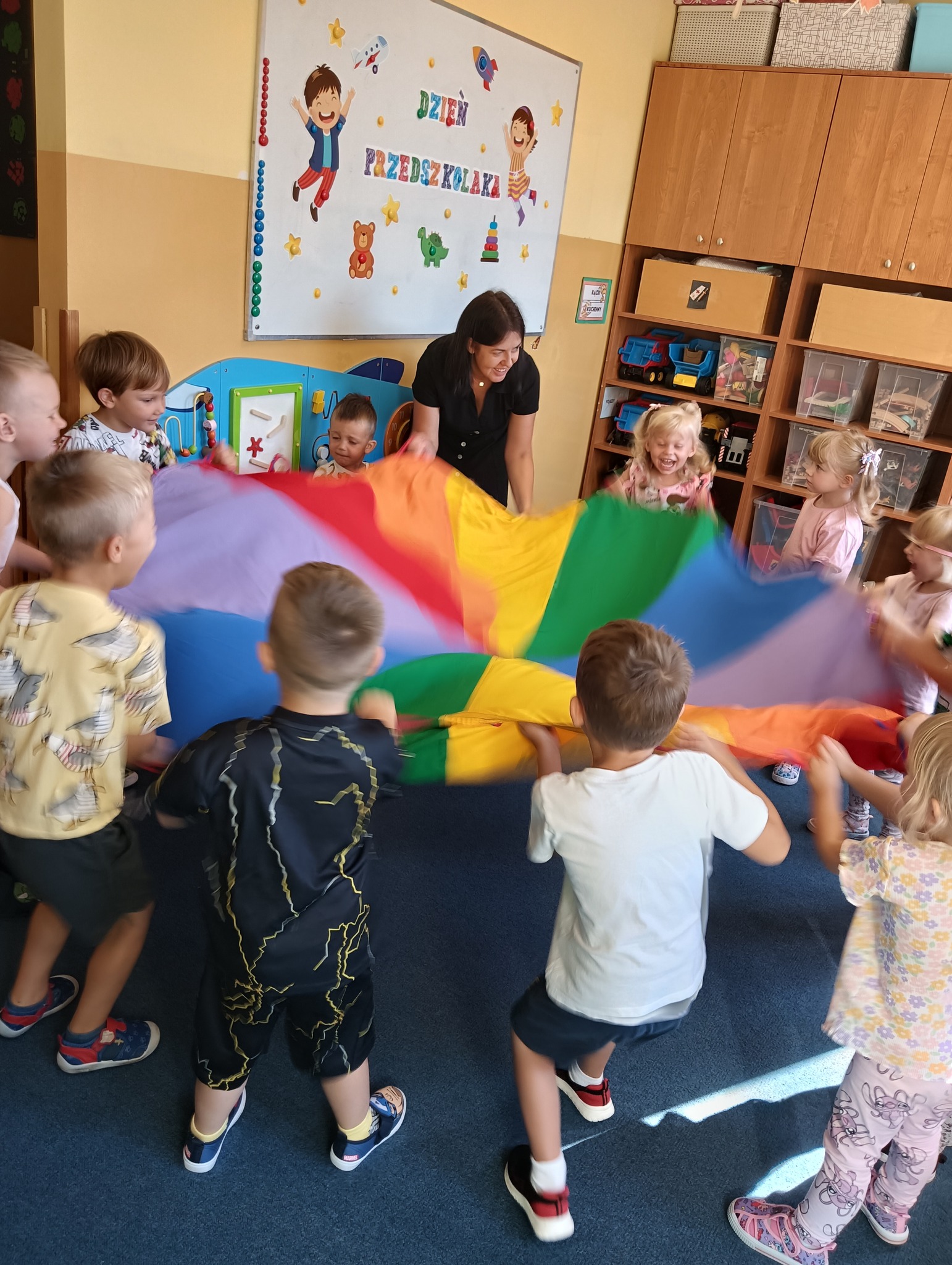Święto rozpoczęło się od zabaw z chustą animacyjną, które pozwoliły dzieciom rozwijać współpracę, koordynację ruchową oraz umiejętność działania w grupie. Kolorowa chusta i różnorodne zadania sprawiły przedszkolakom wiele radości i dostarczyły mnóstwo śmiechu.