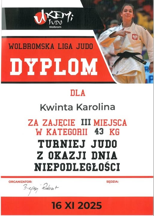 16 listopada 2025r. w Wolbromiu odbył się Turniej Judo z okazji Dnia Niepodległości, podczas którego nasza uczennica klasy IV, Karolina Kwinta, zdobyła III miejsce!