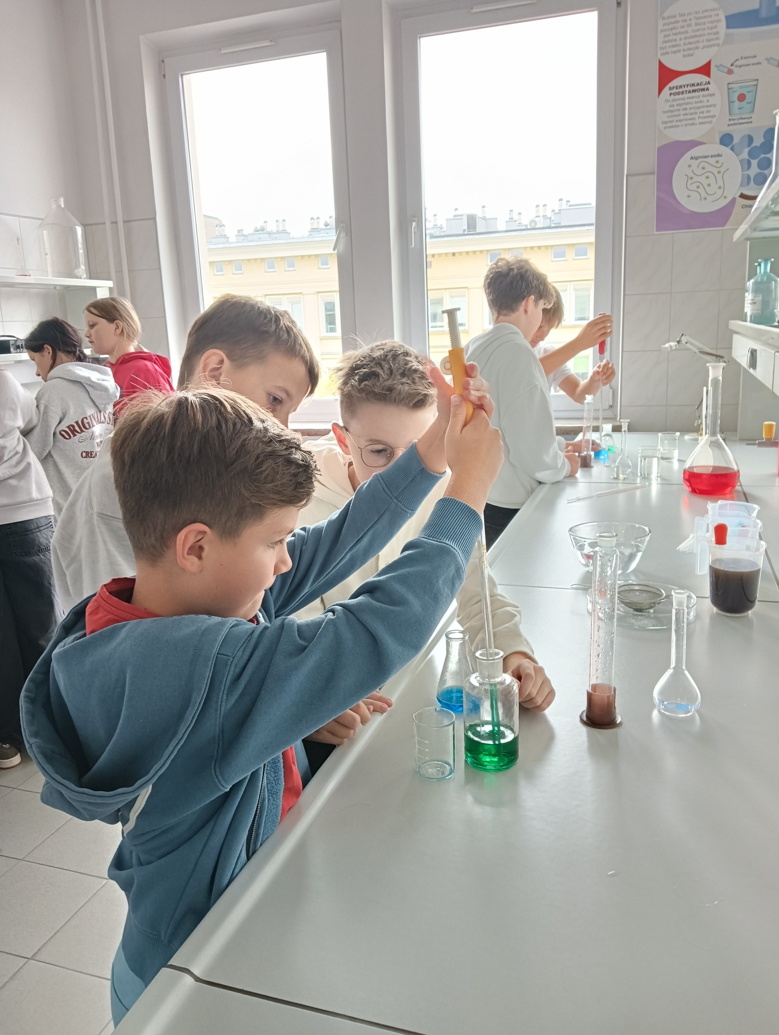 30 września 2025r. gościliśmy w Akademii Górniczo-Hutniczej w Krakowie. Zajęcia miały charakter naukowy. Na Wydziale Inżynierii Materiałowej i Ceramiki badaliśmy właściwości substancji. Poznawaliśmy rodzaje szkieł laboratoryjnych i wykonywaliśmy doświadczenia z ich użyciem. Było bardzo ciekawie. Nawet stłuczona menzurka dostarczyła nam wiedzy o właściwościach i cenach naczyń laboratoryjnych. Najbardziej podobało nam się tworzenie bubble tea. Po zajęciach laboratoryjnych p. dr Piotr pokazał nam niesamowitą ekspozycję specjalną minerałów i skamieniałości w Muzeum Geologicznym Wydziału Geologii, Geofizyki i Ochrony Środowiska AGH.